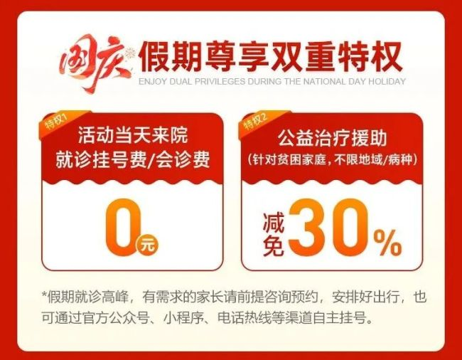 为切实满足广大家长的就医需求,医院提前部署、精心筹备,不仅全力保障双节期间诊疗服务的高效有序,更推出重磅会诊福利,为孩子的健康保驾护航。